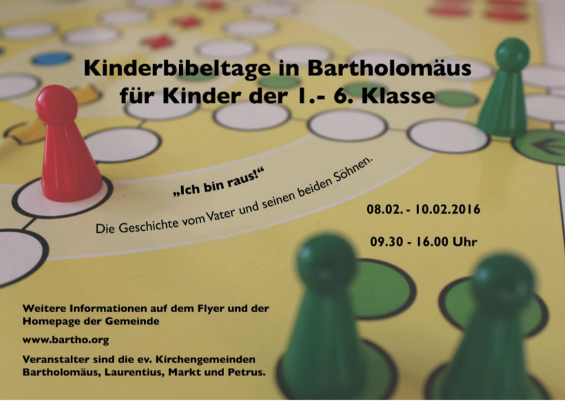Nächste Woche starten die diesjährigen Kinderbibeltage vom 08. bis 10. Februar 2016, jeweils 9.30-16.00 Uhr. Unter dem Motto „Ich bin raus!“ sind alle Kinder von der 1. bis zur 6. Klasse eingeladen. Nähere Informationen finden Sie hier.